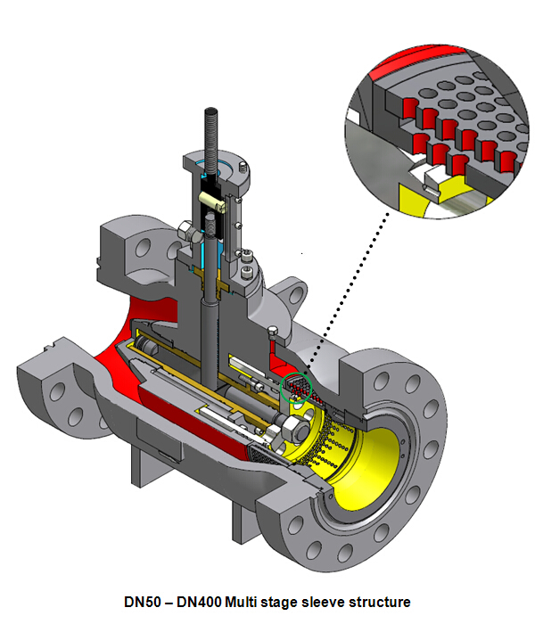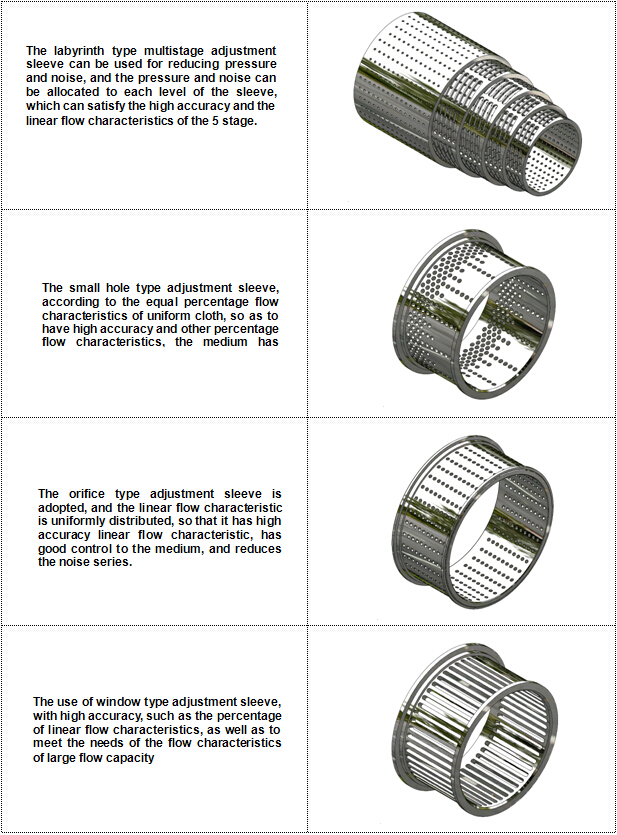 Multi stage sleeve structure![]() Pressure regulating is carried out through multi-stage sleeve of a series of small holes, and in the middle of the multi-stage sleeve to control the flow rate, energy dispersion is controlled, so that the noise is very low. At the same time, the pressure adjustment is done through the center of the sleeve.