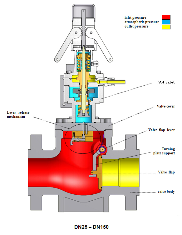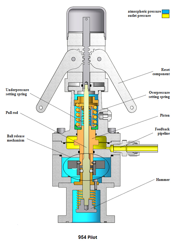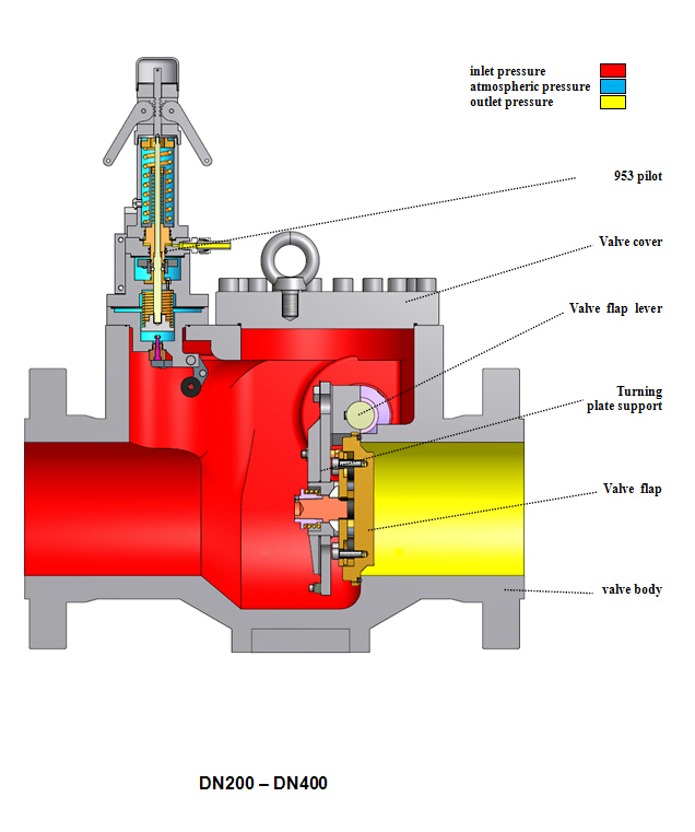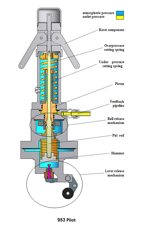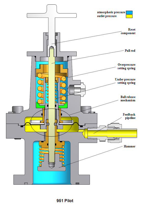 Safety shut-off valve is controlled by pilot . Overpressure or underpressure release feature is when monitored downstream operating pressure exceeds set-point range, the pressure signal fed back to the pilot (pilot valve), the pilot piston moving up or moving down, so that the trolley trip, hammer down the impact of the firing pin and firing pin moves down makes disengage the hook and flap, flap valve is closed down, thereby cutting off gas to the downstream pipeline, protect downstream equipment and pipeline safety.