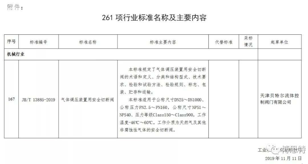 ? 繼公司主持編寫的《撬裝式燃?xì)鉁p壓裝置》等行業(yè)標(biāo)準(zhǔn)發(fā)布實(shí)施后,由子公司天津貝特爾流體控制閥門有限公司起草的《氣體調(diào)壓裝置用安全切斷閥》行業(yè)標(biāo)準(zhǔn),于2019年11月11日通過(guò)工業(yè)和信息化部批準(zhǔn)及公示,標(biāo)準(zhǔn)號(hào):JB/T 13885-2019。