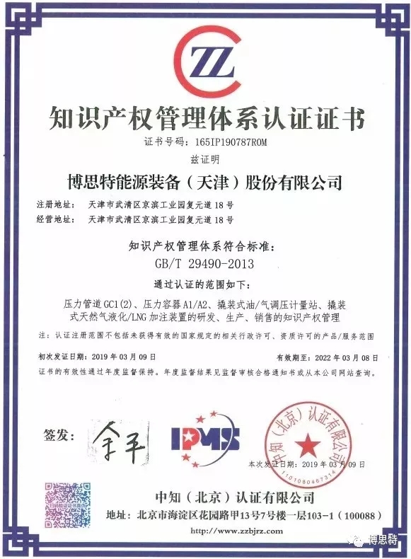? 2019年3月9日,博思特能源裝備(天津)股份有限公司順利通過(guò)知識(shí)產(chǎn)權(quán)管理體系認(rèn)證,取得由中知(北京)認(rèn)證有限公司頒發(fā)的認(rèn)證證書,這標(biāo)志著博思特公司在知識(shí)產(chǎn)權(quán)規(guī)范化管理、運(yùn)用及風(fēng)險(xiǎn)防范等方面邁上一個(gè)新臺(tái)階。 ?