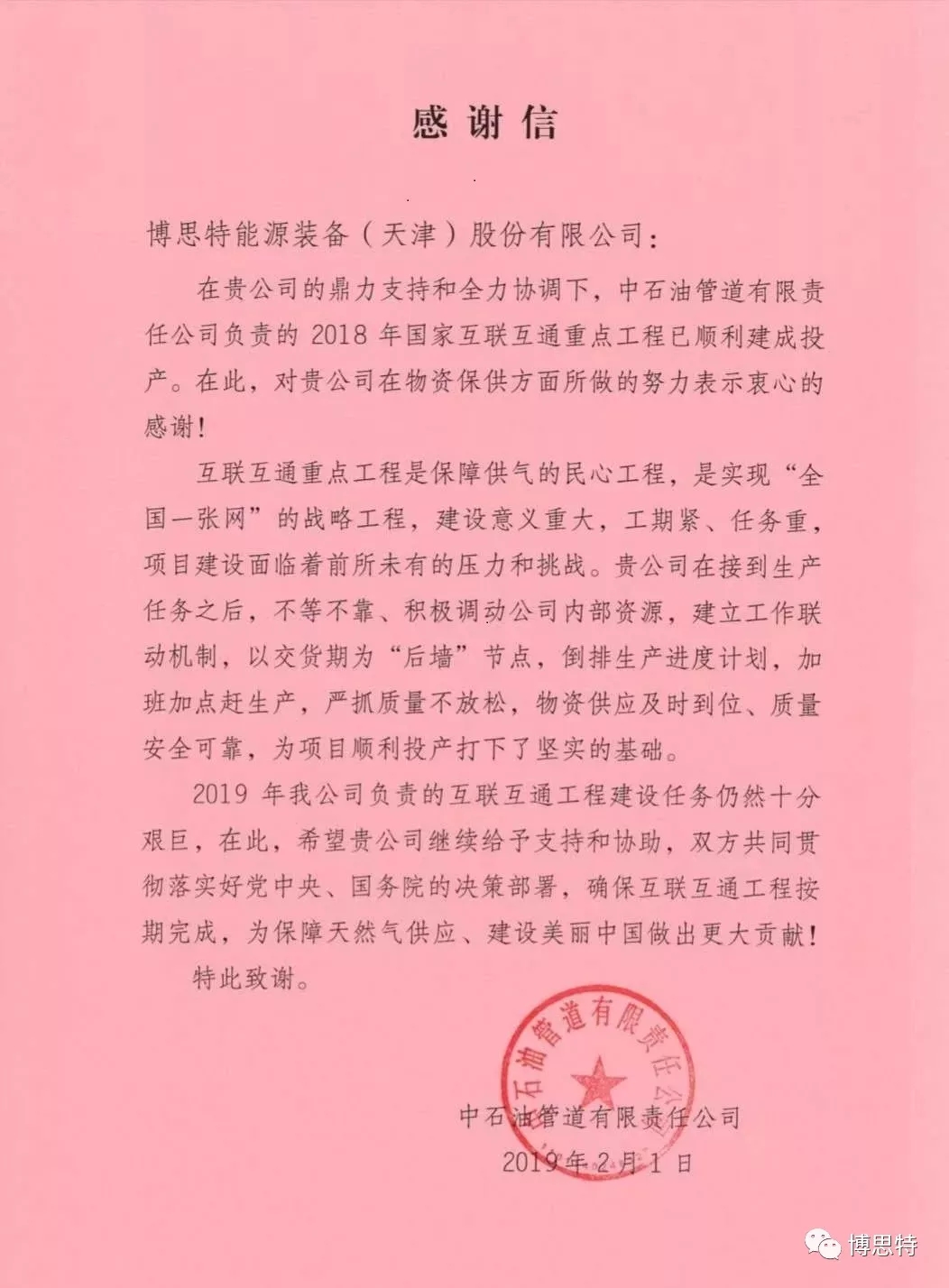 ? 2019年2月1日,公司收到來(lái)自中石油管道有限責(zé)任公司的感謝信??蛻舾叨仍u(píng)價(jià)了我公司在2018年國(guó)家互聯(lián)互通工程物資保供方面所做的努力,同時(shí)肯定了博思特產(chǎn)品供應(yīng)及時(shí)到位、質(zhì)量安全可靠。