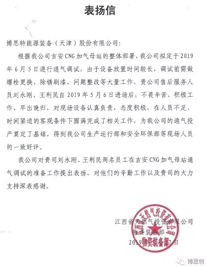 ? ? 用敬業(yè)的心做專業(yè)的事!做好每一次安裝、投產(chǎn)、保運(yùn)、售后服務(wù)!一封封感謝信,是暖心的榮譽(yù),彰顯的更是博思特人堅(jiān)強(qiáng)卓越的執(zhí)行力!