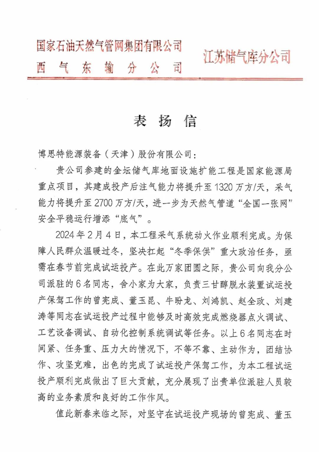 本感謝信是公司繼收到國(guó)家管網(wǎng)文23儲(chǔ)氣庫(kù)單列日處理量1000萬(wàn)方脫水裝置成功投產(chǎn)后的又一封表?yè)P(yáng)信,在此由衷感謝江蘇儲(chǔ)氣庫(kù)分公司給予我們的信任和認(rèn)可,同時(shí)向春節(jié)期間依然堅(jiān)守在該項(xiàng)目的各位優(yōu)秀同事們道一聲:辛苦了!