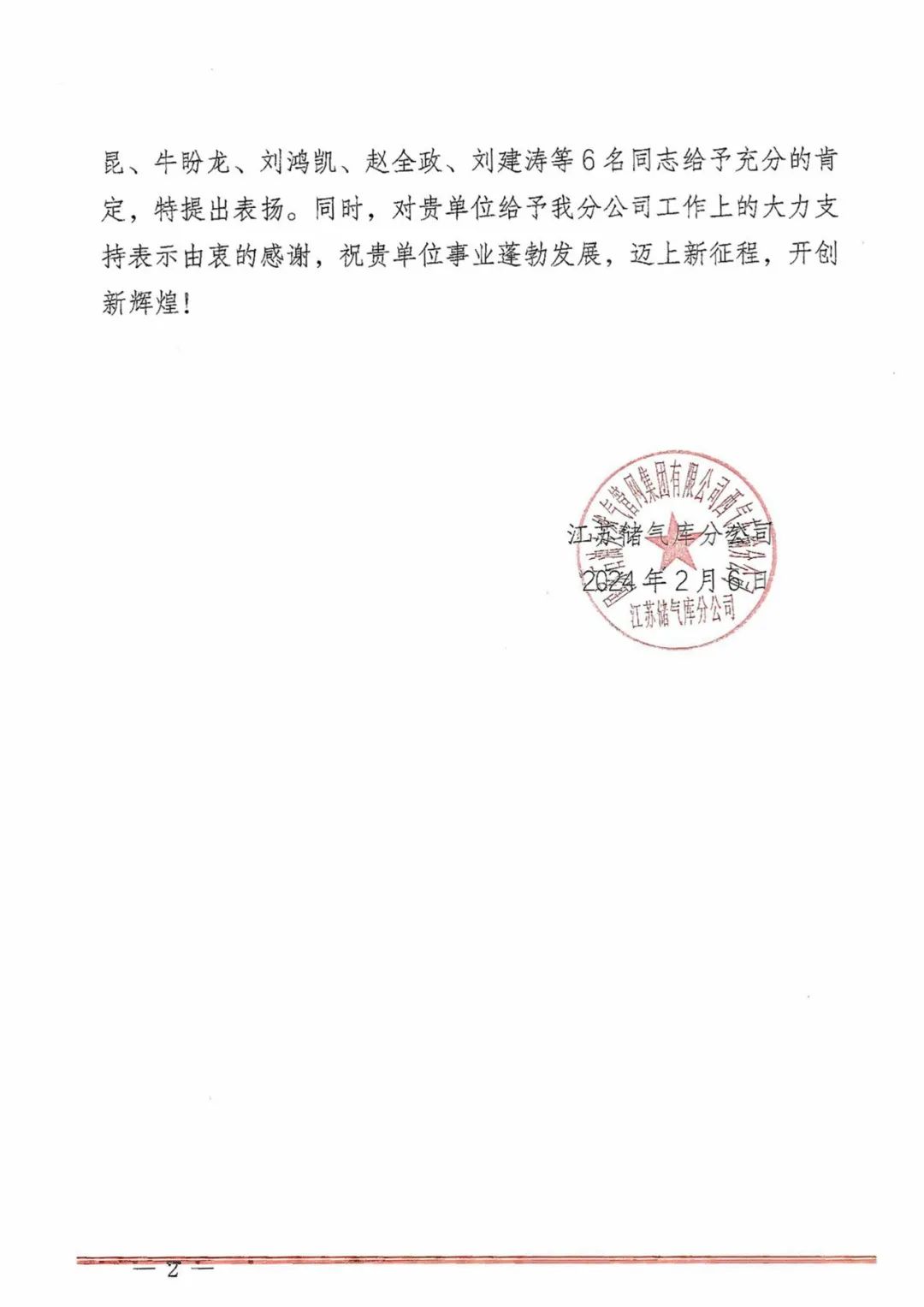 公司新聞 春節(jié)賀禮——國(guó)家管網(wǎng)江蘇儲(chǔ)氣庫(kù)分公司發(fā)來(lái)表?yè)P(yáng)信!發(fā)布時(shí)間:2024-02-09 瀏覽次數(shù):432次 文章來(lái)源:原創(chuàng)
