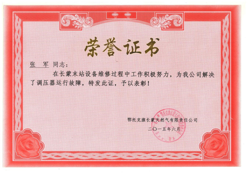 公司售后服務(wù)部員工宋玉興,在河北遷安大五里分輸站項目設(shè)備調(diào)試過程中,服務(wù)技能和態(tài)度得到用戶的好評,用戶為宋玉興頒發(fā)了榮譽證書。