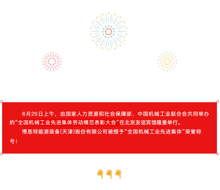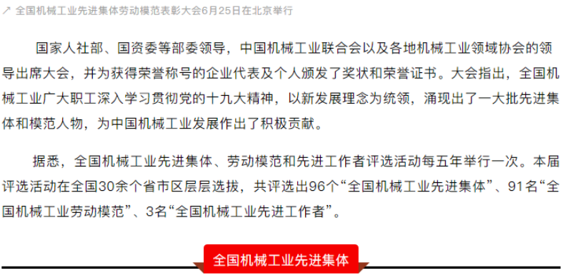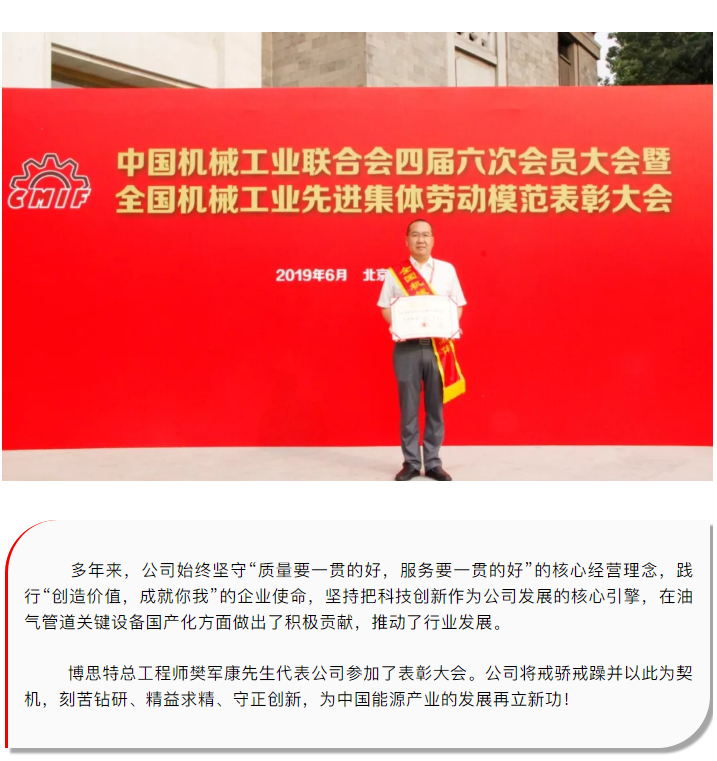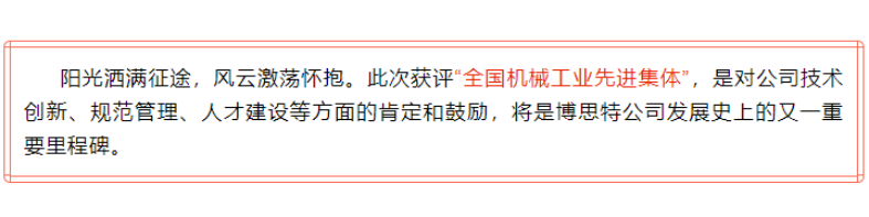 公司新聞 博思特公司榮獲“全國(guó)機(jī)械工業(yè)先進(jìn)集體”榮譽(yù)稱(chēng)號(hào)發(fā)布時(shí)間:2019-06-26 瀏覽次數(shù):4327次 文章來(lái)源:原創(chuàng)